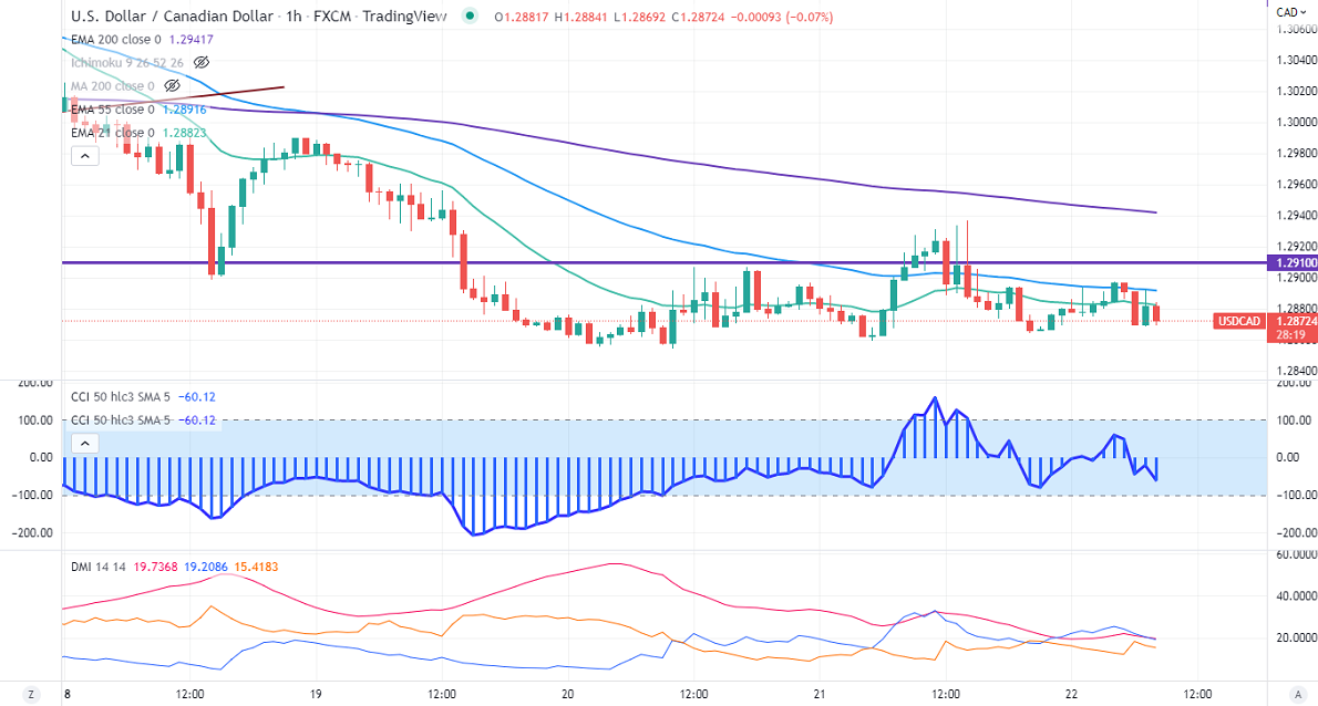 USDCAD trades lower and closed below 1.29000 on Canadian dollar strength. The minor surge in Canada's inflation from 7.7% to 8.1% increased hopes of a further hawkish rate hike by the BOC. Markets eye Canadian retail sales data today for further direction. Technically in the 1 -Hour chart, the pair is holding below the short-term ( 21- EMA), 55- EMA, and the long-term moving average of 200 EMA (1.29424). Any close above 1.29450 confirms the intraday bullish trend. A jump to 1.2960/1.300/1.3050 is possible. USDCAD hits a low of 1.28700 at the time of writing and is currently trading around 1.28773.