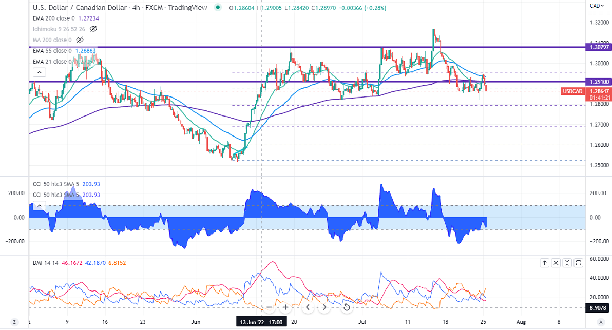 USDCAD gained more than 100 pips from a low of 1.28220 despite upbeat Canadian retail sales. It rose 2.2% in May compared to an estimate of 1.6%, core retail sales surged 1.9% vs. 1.1%. Technically in the 4 -hour chart, the pair is holding below short-term (21- EMA), 55- EMA, and the long-term moving average of 200 EMA (1.29129). Any close above 1.29450 confirms the intraday bullish trend. A jump to 1.2960/1.300/1.3050 is possible. USDCAD hits a low of 1.28617 at the time of writing and is currently trading around 1.28643.