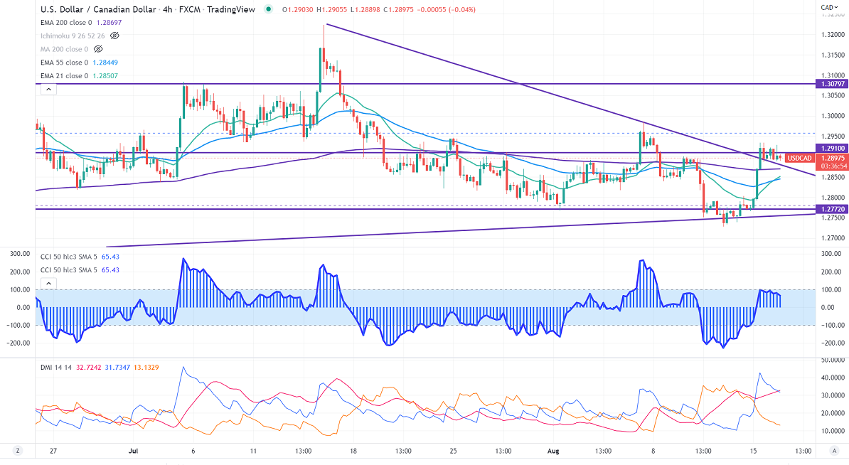 USDCAD regained sharply on board-based US dollar buying. The weak Canadian economic data and declining crude oil prices put pressure on the Canadian dollar at higher levels. Manufacturing sales fell 0.80% in June compared to a forecast of -0.70%. Technically in the 4 -Hour chart, the pair is holding above the short-term( 21- EMA), 55- EMA, and the long-term moving average of 200 EMA (1.28694). Any close below 1.28650 confirms the intraday bearish trend. A dip to 1.2800/1.2760/1.2720 is possible. USDCAD hits a high of 1.29285 at the time of writing and is currently trading around 1.29007.