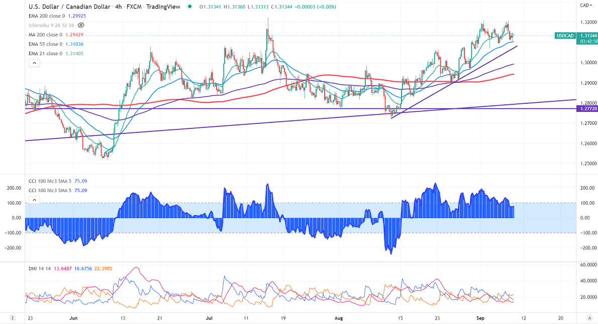 Technically in the 4-Hour chart, the pair is holding below the short-term( 21- EMA), above 55- EMA, and the long-term moving average of 200 EMA (1.29896). Any jump above 1.3220 confirms a bullish continuation. A jump to 1.3300/1.3345/1.3420 is possible. USDCAD hits a high of 1.31718 and is currently trading around 1.31639.