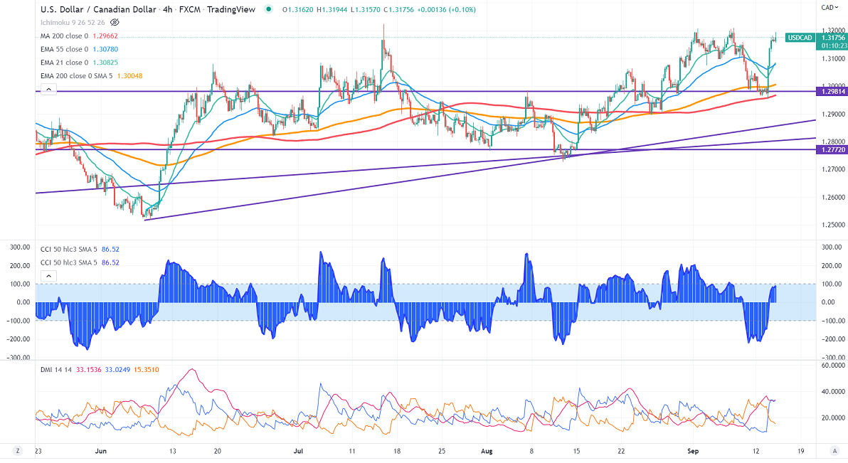 Technically in the 4-Hour chart, the pair is holding below the short-term( 21- EMA), 55- EMA, and above the long-term moving average of 200 EMA (1.30031). Any violation above 1.3225 confirms further bullishness. A jump to 1.3300/1.3350 is possible.