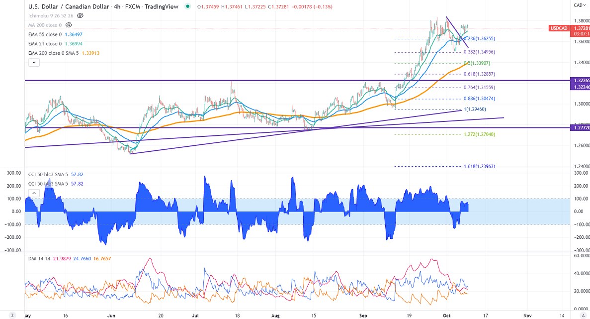 Technically in the 4-Hour chart, the pair is holding above the short-term( 21- EMA), 55- EMA, and the long-term moving average of 200 EMA (1.33880). Any violation above 1.3760 confirms intraday bullishness. A jump to 1.384/1.3900/1.4000 is possible.