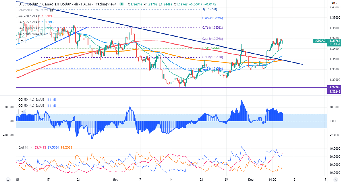 USDCAD pared more than 100 pips after BOC monetary policy. The central bank hiked rates by 50 bpbs to 4.25%, the highest level since 2008. It also said that it would consider "whether the policy interest rate needs to rise further to bring supply and demand back into balance and return inflation to target.". Technically in the 4 -hour chart, the pair is holding below short-term (21- EMA), 55- EMA, and the long-term moving average of 200 EMA (1.34873). Any violation above 1.3700 confirms the intraday bullish trend. A jump to 1.3808/1.3850.is possible. USDCAD hits a high of 1.36894 at the time of writing and is currently trading around 1.36745.
