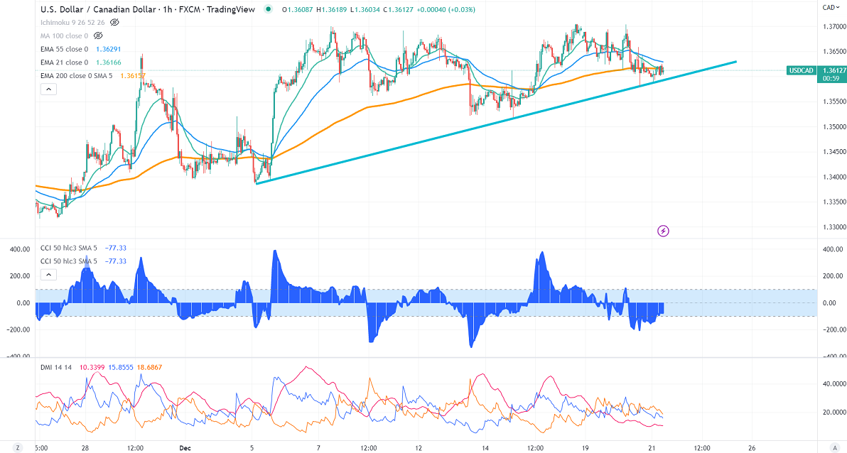 Technically in the 4-Hour chart, the pair is holding below the short-term( 21- EMA), 55 EMA, and above the long-term moving average of 1.35435 (200- EMA). Any violation below 1.3570 confirms further bearishness. A dip to 1.3500/1.34000 is possible.