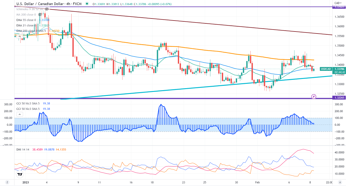 Technically in the 4-Hour chart, the pair is holding below the short-term( 21- EMA), 55 EMA, and the long-term moving average of 1.34255 (200- EMA). Any violation below 1.3360 confirms further bearishness. A dip to 1.3300/1.3220 is possible.