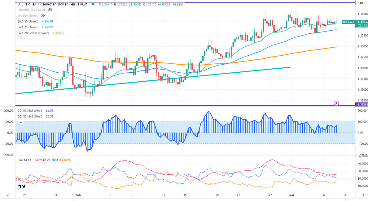 Technically in the 4-Hour chart, the pair is holding above the short-term( 21- EMA), 55 EMA, and the long-term moving average of 1.34959 (200- EMA). Any violation below 1.36000 confirms intraday bearishness. A dip to 1.3550/1.3470/1.3435 is possible.