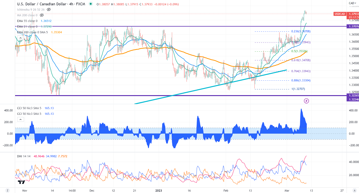 Technically in the 4-Hour chart, the pair is holding above the short-term( 21- EMA), 55 EMA, and the long-term moving average of 1.34959 (200- EMA). Any violation above 1.3810 confirms further bullishness. A jump to 1.3850/1.3890 is possible.