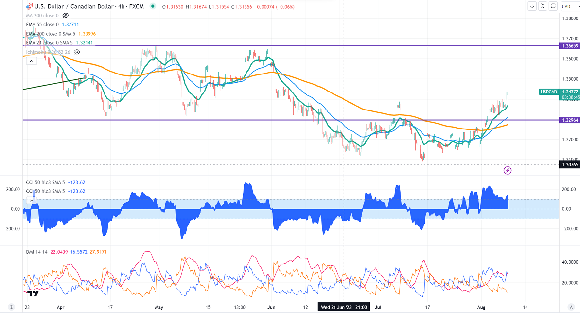 The pair is holding above the short-term( 21- EMA), 55 EMA, and below the long-term moving average of 1.32649 (200- EMA). Any violation above 1.3465 confirms further bullishness. A jump to 1.3500/1.3560 is possible.