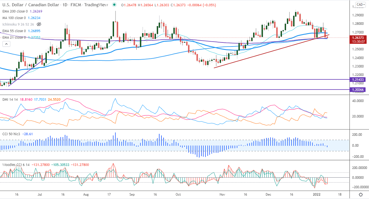 USDCAD lost more than 100 pips from a high of 1.27307 on upbeat Canadian jobs data. It has added 54.7K jobs in Dec vs. the 24.5K estimate (Positive for Canadian dollar). The unemployment rate came at 5.9% vs a forecast of 6.0%. The pre-pandemic level was 5.7%. (Positive for Canadian dollar). The policy divergence between the US Fed and Bank of Canada supports the pair at lower levels. USDCAD hits an intraday low of 1.26303 and currently trading around 1.26376.