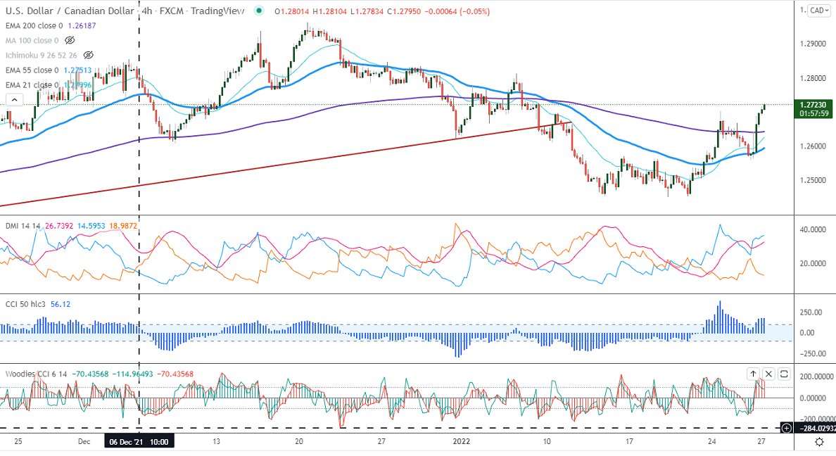 USDCAD gained sharply after BOC and fed monetary policy. The bank of Canada has kept its rates unchanged at 0.25% and signaled a rate hike in the coming months to tackle higher inflation. The slight policy divergence between the US fed and Bank of Canada is supporting the pair at lower levels. USDCAD hits a high of 1.27250 and currently trading around 1.27171.