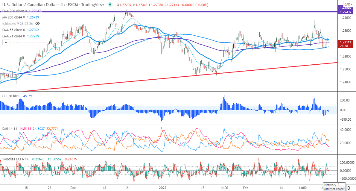 USDCAD is holding below short-term (21 EMA) and medium-term (55 EMA), and above long-term ( 200 MA) in the 4-hour chart.