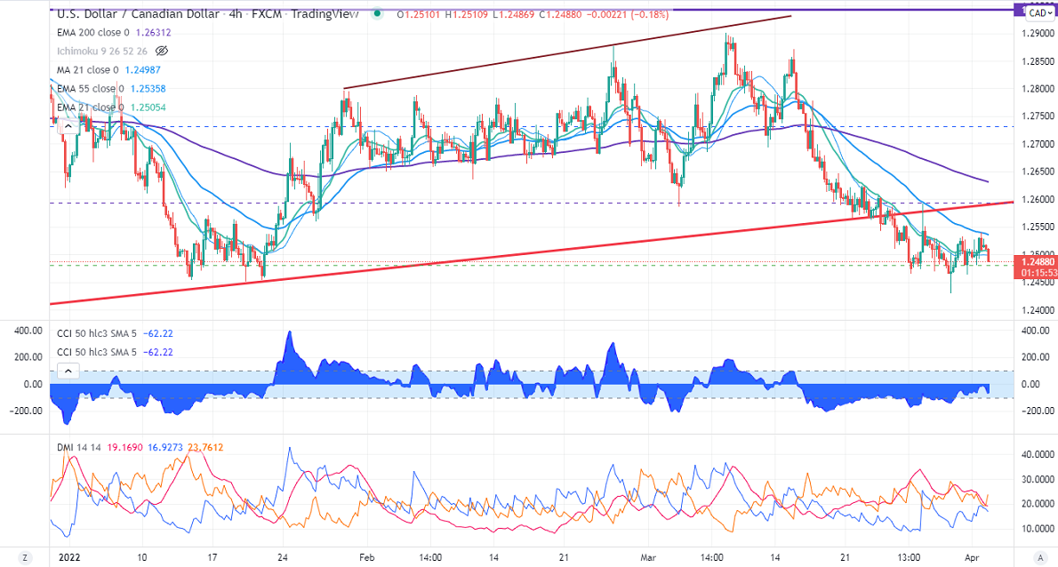 USDCAD is trading weak for the fifth consecutive week on board-based Canadian dollar buying. It shined well against all majors on surging crude3 oil prices. The Russian and Ukraine war has pushed oil prices higher due to sanctions by major countries on Russia.WTI crude oil price lost more than 15% from a minor top of $116.54. Loonie hits an intraday low of 1.24830 and currently trading around 1.24897.