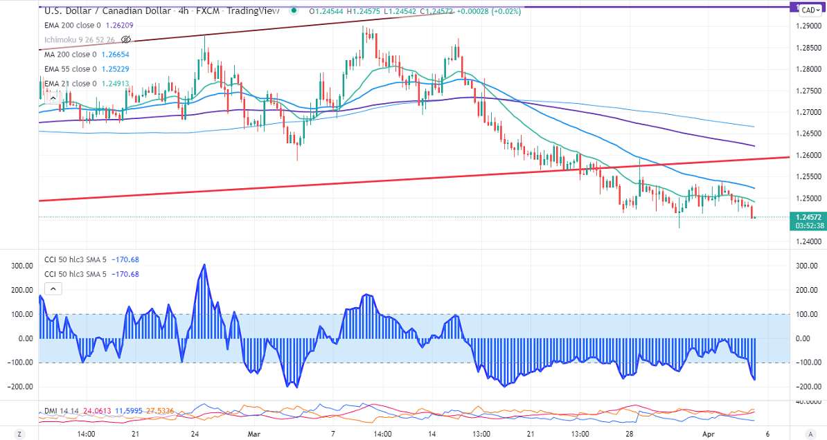 USDCAD trades lower for the second consecutive day and lost more than 150 pips on board-based Canadian dollar buying. It was one the best performers against the US dollar as Crude oil prices surged to $129.42 due to Russia and Ukraine wars. Loonie hits an intraday low of 1.24524 and currently trading around 1.24554.
