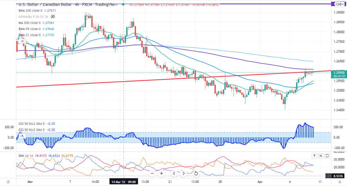 USDCAD surged sharply after a massive sell-off. The fed meeting minutes have signaled a 50 bpbs rate hike in the next policy meeting. The policy divergence between the US fed and the Bank of Canada is supporting Loonie at lower levels. Oil prices slipped for the third consecutive day after European Union delayed the Russian energy sanctions plan. USDCAD hits an intraday high of 1.25985 and currently trading around 1.25949.