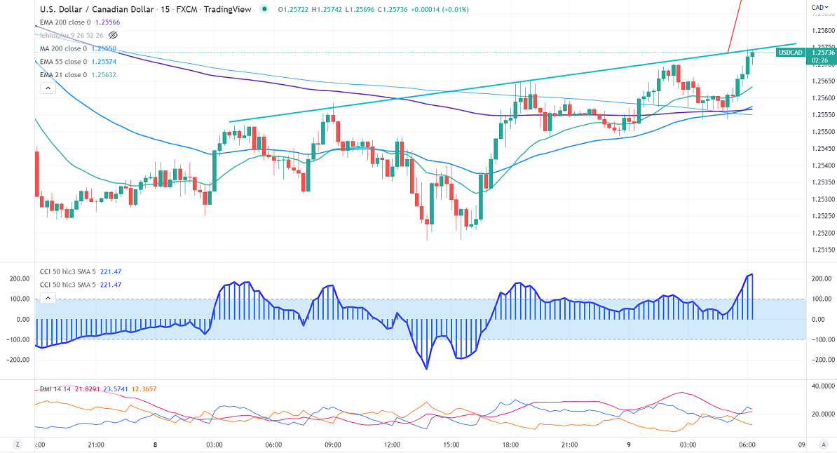 USDCAD showed a nice recovery after five weeks of downtrend despite a jump in crude oil prices. Technically in 15 min chart, the pair is holding above the short term (21- and 55 EMA) and long term moving average of 200 MA (1.2550). Any close above trend line resistance 1.25750 confirms bullish continuation. A jump to 1.2620/1.2660 is possible USDCAD hits an intraday high of 1.25746 and is currently trading around 1.25713.