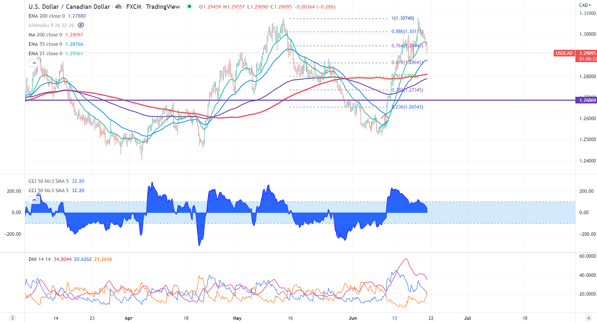 USDCAD formed a temporary top around 1.30788 and started to decline despite the hawkish Fed rate hike. Markets eye Canada's CPI data for further direction. Technically in the hourly chart, the pair is holding above the short-term (21- and 55 EMA) and below the long-term moving average of 200 MA (1.2870). Any close below that level of 1.2870 confirms a bearish continuation. A dip to 1.2800/1.2760 is possible USDCAD hits an intraday low of 1.29129 and is currently trading around 1.29162.