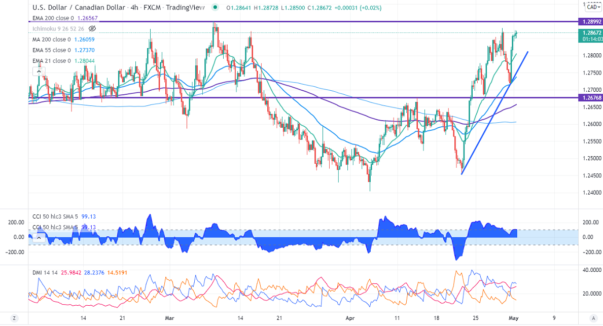 USDCAD regained above 1.2850 levels on board-based US dollar buying. It hits a 20-year high at 103.92 on rate hike expectations. According to the Fed watch tool, the probability for a 50 bpbs rate hike in May has increased to 99.10% from 96% a week ago. The policy divergence between the US fed and the Bank of Canada puts pressure on Loonie at higher levels. USDCAD hits an intraday high of 1.27500 and currently trading around 1.27261.