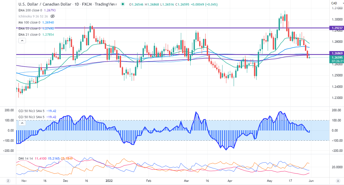 USDCAD continues to trade lower despite weak Canadian GDP. The Canadian economic growth slumped to a 3.1% annualized rate in the first quarter compared to a forecast of 3%. The household income of Canadian people surged to 40 years high, and the savings rate improved. According to the Fed watch tool, the probability for a 50 bpbs rate hike in June has increased to 96.8% from 94.9% a week ago. USDCAD hits an intraday high of 1.26526 and currently trading around 1.26552.