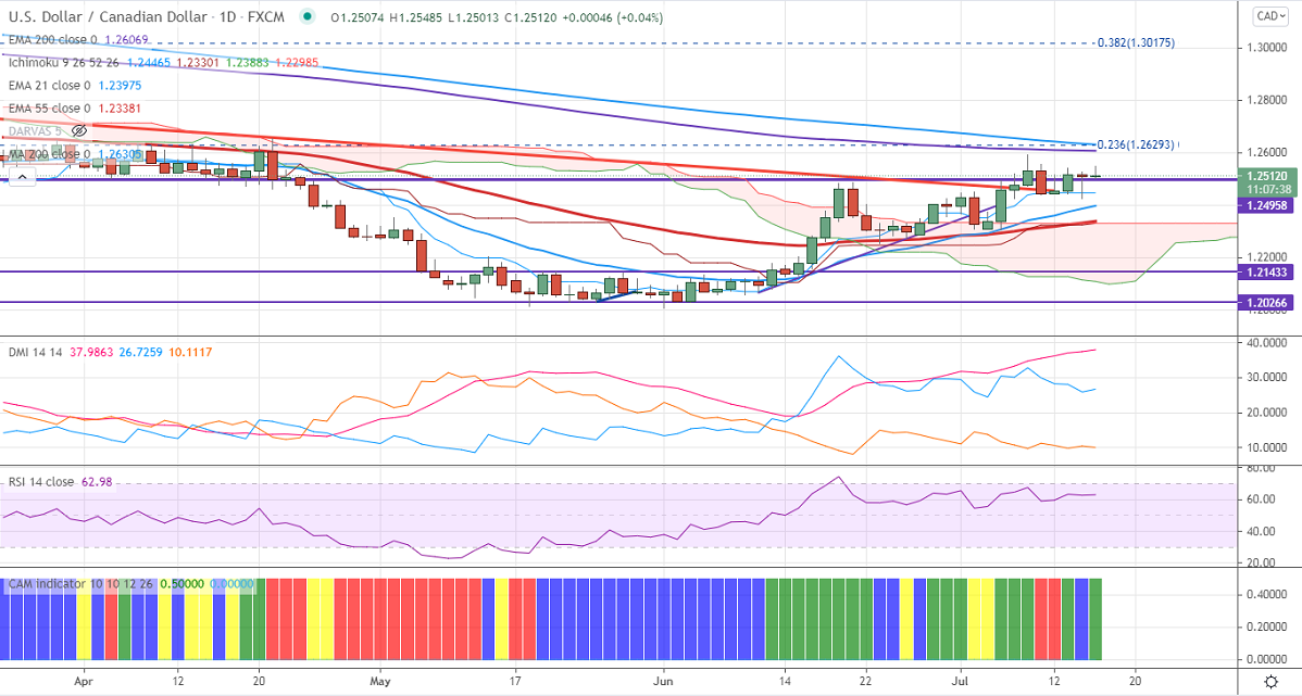 The pair surged more than 80 pips after the Bank of Canada monetary policy. The central bank has kept its rates unchanged and cut its weekly bond-buying program to C$2billion. The Bank of Canada downgraded its 2021 growth to 6.0% and revised its 2022 estimate to 4.6% from 3.7%. Markets eye Canadian ADP employment and US Philly Fed manufacturing for further direction. The minor sell-off in crude oil prices is preventing the pair from decline. It has taken support near 200-H MA and is currently trading around 1.24853.