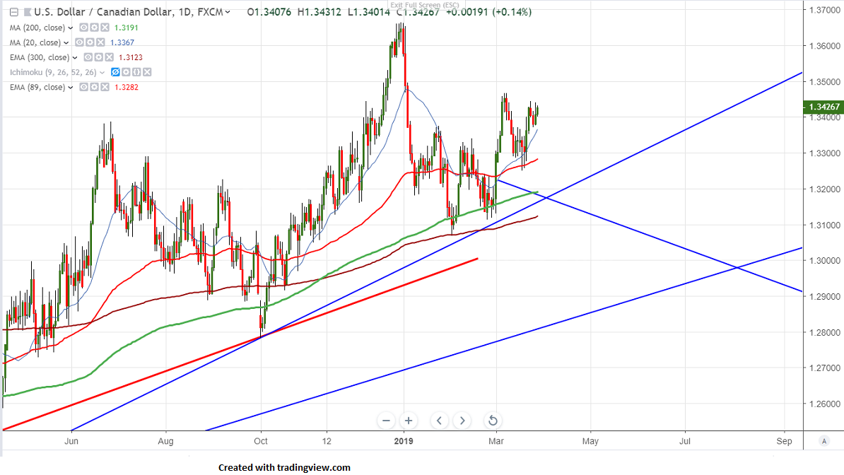USDCAD is trading higher for past two days and jumped more than 50 pips from the low of 1.33720 made on Mar 26th 2019 on account of broad based US dollar buying and declining crude oil price. It has formed minor top around 1.34662 and declined till 1.32550.The declining US 10 year bond yield also supporting US dollar .