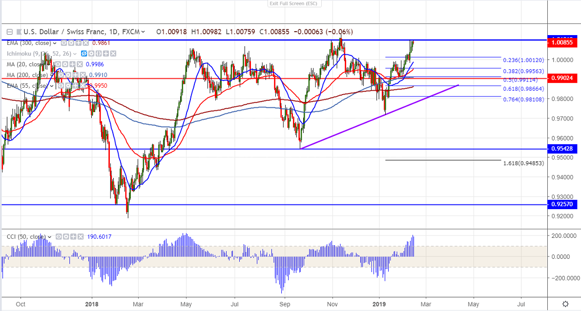 USDCHF is consolidating between narrow range in past two trading days. The pair hits high of 1.00982 for the day and shown a minor decline. It has formed almost a triple top near 1.0100 level. The pair has jumped more than 350 pips in past one month on improving market risk sentiment. It is currently trading around 1.00854.
