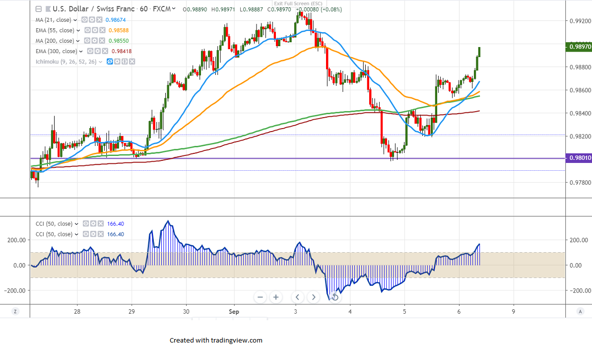 USDCHF is trading higher for the past two days and jumped nearly 90 pips on easing the US-China trade war. US bond yield recovered more than 7% on upbeat US ADP employment and ISM services PMI data. US dollar index took support near 21-day MA and shown a minor recovery. Any minor bullishness only above 98.60. It hits an intraday low of 0.98942 and is currently trading around 0.98942.