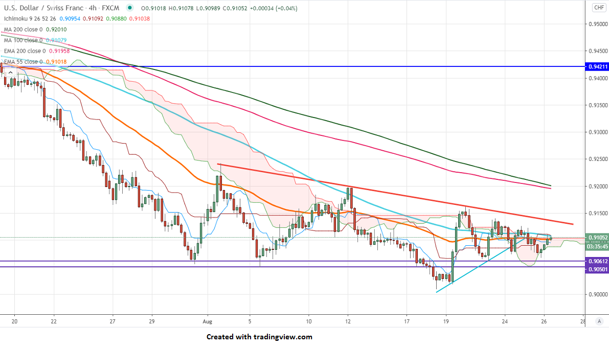 The pair is still in a downtrend, any break above 0.9197 (Aug 12th high) confirms bullish continuation. A jump till 0.9240/0.93625 is possible. The near-term support is around 0.9050, any break below targets 0.9020/0.8940. The decline from 0.9900 will get completed at 0.9050 only if it breaks 0.9250.