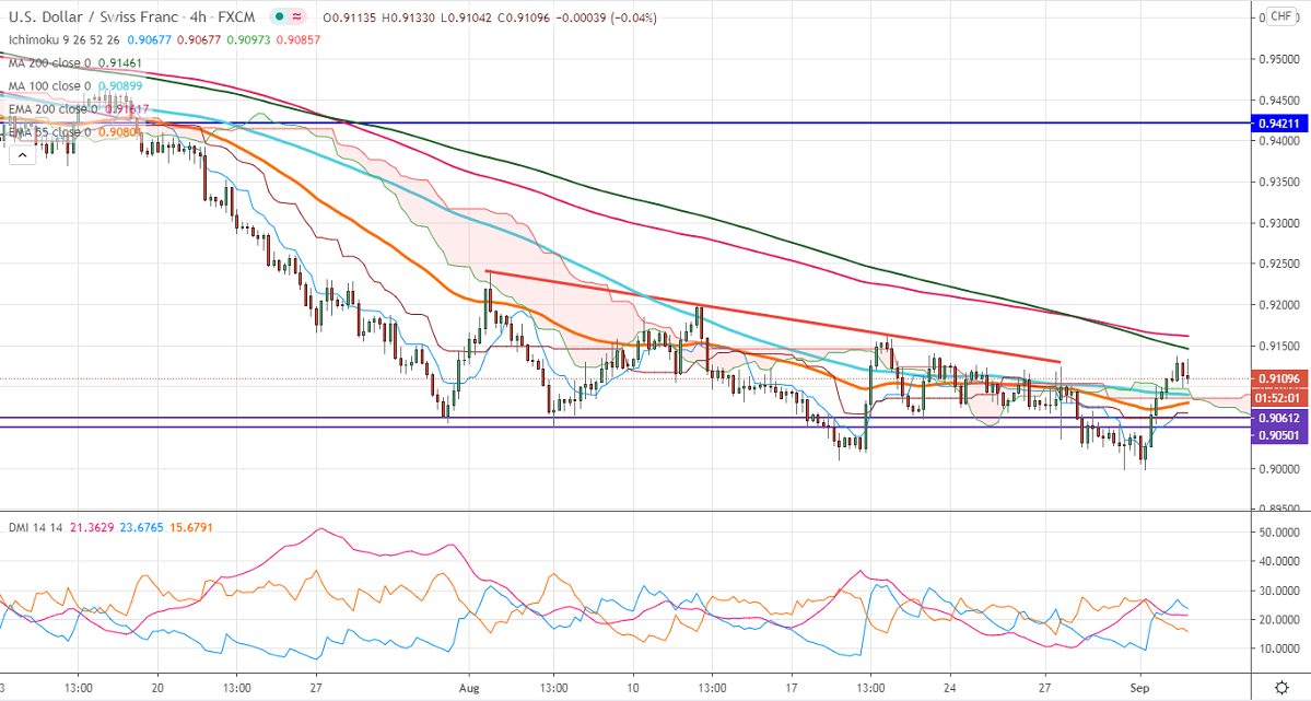 USDCHF has once again declined after hitting a high of 0.91350 on weak US ADP data. US economy has added 428000 jobs in Aug compared to a forecast of 1250K. US dollar index has shown a minor correction from an intraday high of 92.87. Market eye US NFP data for further direction.