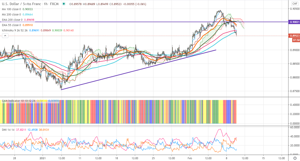 USDCHF is retreating after hitting a multi-month high 0.90440 level. The pair is still in a bullish trend as long as 0.8925 (resistance turned into support) holds. The upbeat market sentiment and hopes of more fiscal stimulus have decreased for Safe-haven assets like the Swiss franc. DXY is trading well below 91 levels; any violation below 90 confirms a bearish continuation. With no major data in focus today, markets eye US CPI and Fed chairman Powell speech tomorrow for further direction.