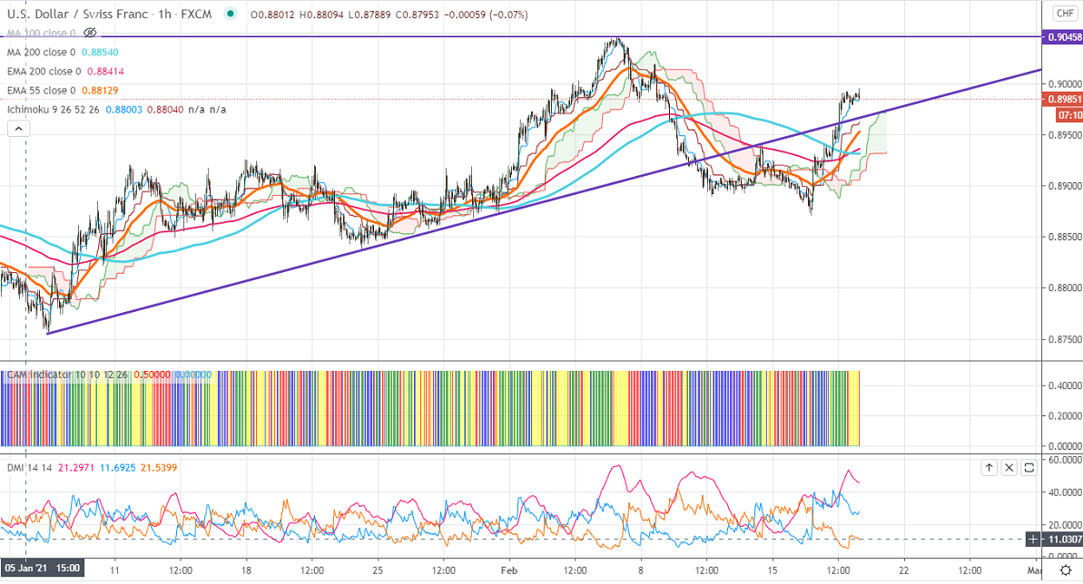 USDCHF is trading higher and holding well above 0.8950 levels on broad-based US dollar buying. The jump in US 10- year yield and upbeat US retail sales is supporting the US dollar index at lower levels. It rose 5.3% in Jan m/m, the highest jump in the seventh months. The data came much better than the estimate of 1.1%. Markets eye US initial jobless claims and Philly fed manufacturing for further direction.