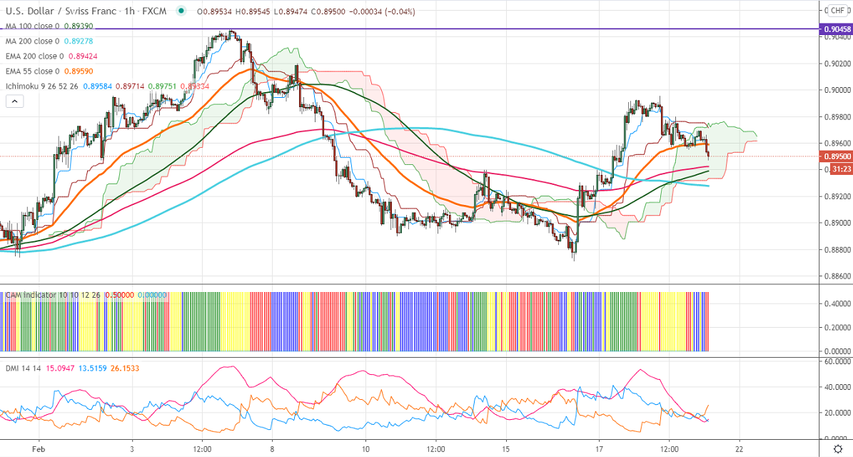 USDCHF is trading slightly lower after hitting a high of 0.89954. The broad-based US dollar selling on upbeat market sentiment is putting pressure on this pair at higher levels. The US 10- year yield hits a multi-year high at 1.32% is preventing the dollar from the further downside. The number of people who have filed for unemployment benefits rose to 861000 in the week ended Feb 13 compared to a forecast of 775K. US building permits rose by 10% while housing starts plunged by 6%. Markets eye flash manufacturing sales and existing home sales for further direction.