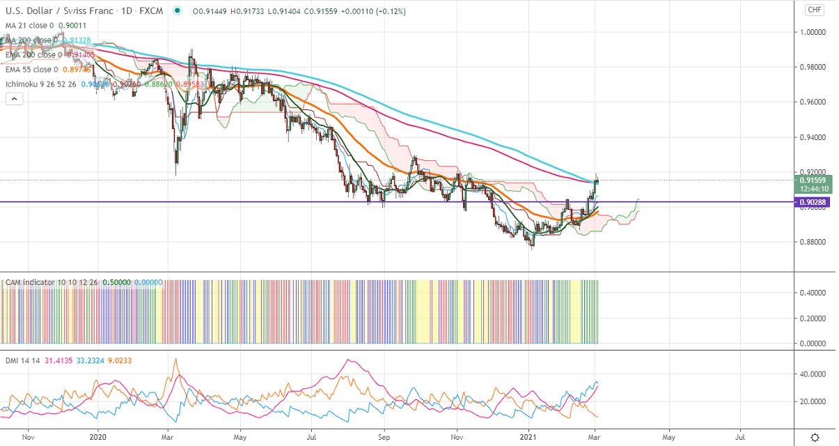 USDCHF has once again recovered after a minor decline below 200- day MA. The overall trend is still bullish as long as support 0.9070 holds. The jump in US bond yield and risk aversion is supporting the pair at lower levels. DXY formed a minor top around 91.39 and declined to 90.67. Market eyes US ADP employment and ISM Services PMI for further direction. The pair hits an intraday low of 0.91403 and is currently trading around 0.91691.