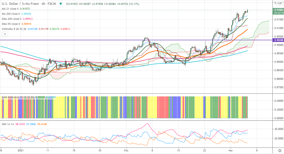 USDCHF is trading weak for a third consecutive week and hits the highest level since Nov 2020. The surge in US bond yield in hopes of an increase in inflation due to economic recovery. The number of private jobs added by 117000 in Feb compared to a forecast of 203k. The US SIM services came at 55.3 in Feb vs an estimate of 58.70. The overall trend is still bullish as long as support 0.9070 holds. DXY is holding above 91 levels, any violation above 91.60 confirms further bullishness. The pair hits an intraday high of 0.92053 and is currently trading around 0.92046.
