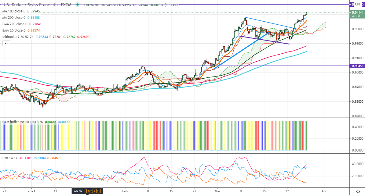 USDCHF breaks significant resistance 0.9375 and holding well above that level on strong US dollar buying. The safe-haven demand has increased on EU ban on the vaccine and the blockage of the Suez Canal. The DXY is holding above 92.67 (200- day EMA). A jump till 93.25/93.60.USDCHF hits an intraday high of 0.9410 and is currently trading around 0.94061.