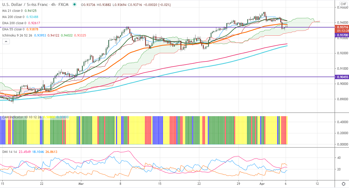 USDCHF has declined more than 130 pips after an 8-month high. The slight weakness in the US dollar is dragging the pair down. DXY has halted its 6-week of the bullish trend and lost more than 100 pips. The minor sell-off in US bond yield is also putting pressure on the US dollar. US ISM services surged to a record high in Mar due to upbeat growth in new orders. It came at 63.7comapred to a forecast of 58.3. USDCHF hits an intraday low of 0.93506 and is currently trading around 0.93745.