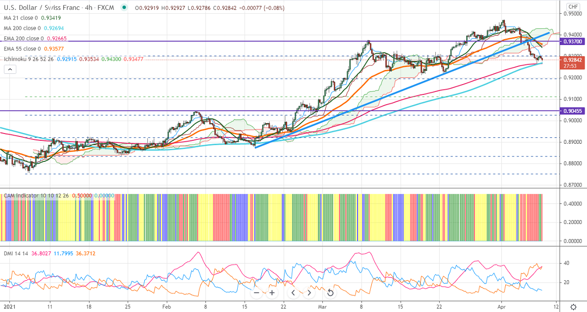 USDCHF has taken support near 200- 4H MA and shown a minor recovery. The overall trend is still on the bearish side as long as resistance 0.94725 holds. The FOMC meeting minutes confirm that the Fed will continue its accommodative policy stance until inflation and employment targets are achieved. The slight weakness in the US 10-year bond yield also putting pressure on the US dollar. DXY recovered slightly from a low of 92.13. Significant weakness only if it breaks below 91.80. USDCHF hits an intraday low of 0.93023 and is currently trading around 0.92841.