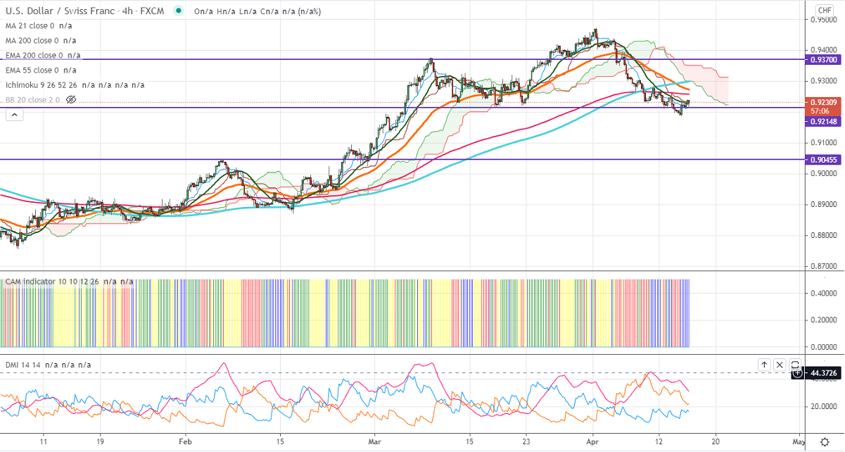 USDCHF is trading weak after hitting a high of 0.92400 on broad-based US dollar selling. . The US dollar index and USDCHF are positively correlated to each other. DXY is holding well below 92 levels, any violation below 91.50 will drag the index down to 91. The US 10-yield declined more than 5% despite better than expected US CPI data. Markets eye US retail sales, jobless claims, and Philly Fed manufacturing index. The overall trend is bearish as long as resistance 0.9370 holds. USDCHF hits an intraday low of 0.92189 and is currently trading around 0.92198.