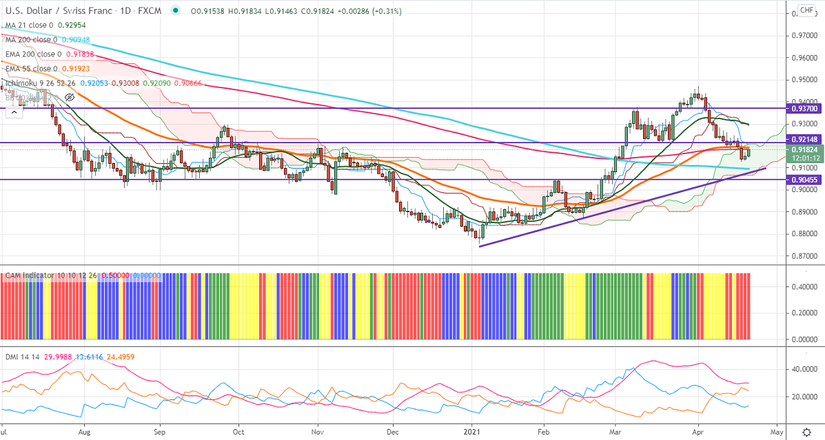 USDCHF has shown a minor recovery of more than 50 pips on slight strength in the US dollar. USDCHF was one of the worst performers this month and lost more than 300 pips on broad-based US dollar selling. The minor sell-off in US bond yield also putting pressure on this pair. The new lockdown restrictions across the world and the surge in coronavirus vaccine are supporting the US dollar at lower levels.DXY has jumped more than 50 pips from a low of 90.85. USDCHF hits an intraday high of 0.91821 and is currently trading around 0.91826.