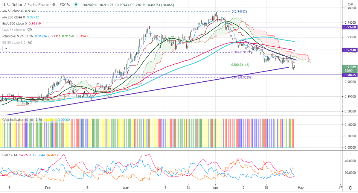 USDCHF has broken significant support 0.9120 and hits a multi-week low on broad-based US dollar selling. . The central bank has kept its rates unchanged and left its $120bn bond-buying programs. They have said that vaccine rollout has strengthened economic activity and employment. The intraday trend is bearish as long as resistance 0.9155 holds. The slight recovery in US bond yield from yesterday's low of 1.608%. DXY is trading below 90.60, a dip till 90.20/90 likely. The long-term trend is still on the downside as long as resistance 0.94725 holds.