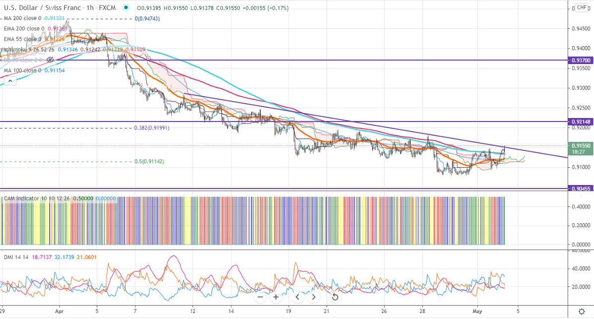 USDCHF is trading higher and broken 0.91500 after a long consolidation. The intraday trend is bullish as long as 0.9120 holds. The broad-based US dollar buying is supporting prices at lower levels. The US ISM manufacturing index came at 60.7 for Apr slightly lowered compared to the forecast of 65%. The US dollar index jumped sharply after hitting a minor bottom around 90.86. Any violation above 91.50 confirms minor bullishness. The long-term trend is still on the downside as long as resistance 0.94725 holds.