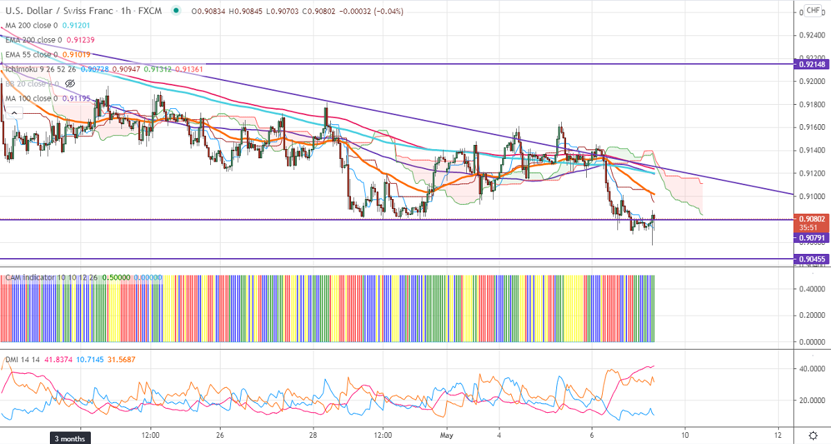 Ichimoku Analysis- The pair is trading slightly below hourly Kijun-Sen and cloud. Major bearishness only if it breaks 0.9080.