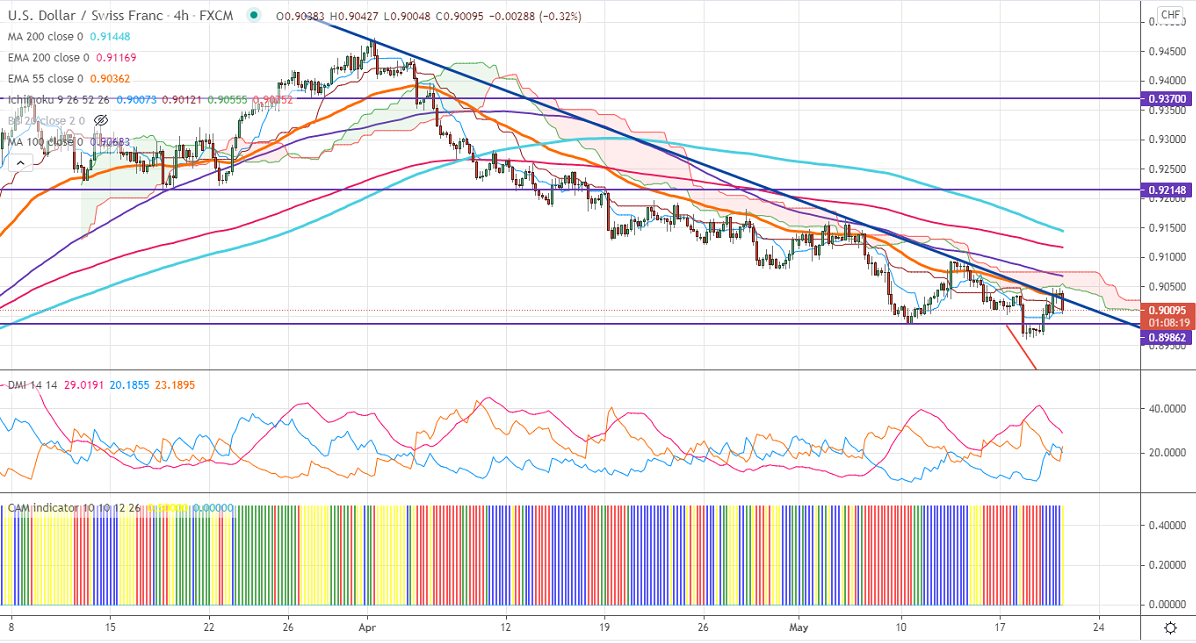 The pair is holding well below 4- H Kijun-Sen, Tenken-Sen, and cloud. The near-term support is around 0.8960. Any close below 0.8960 will take the pair to next level to 0.8900/0.8835. On the higher side, near-term resistance is around 0.9050. Any breach above targets 0.90925/0.9150.