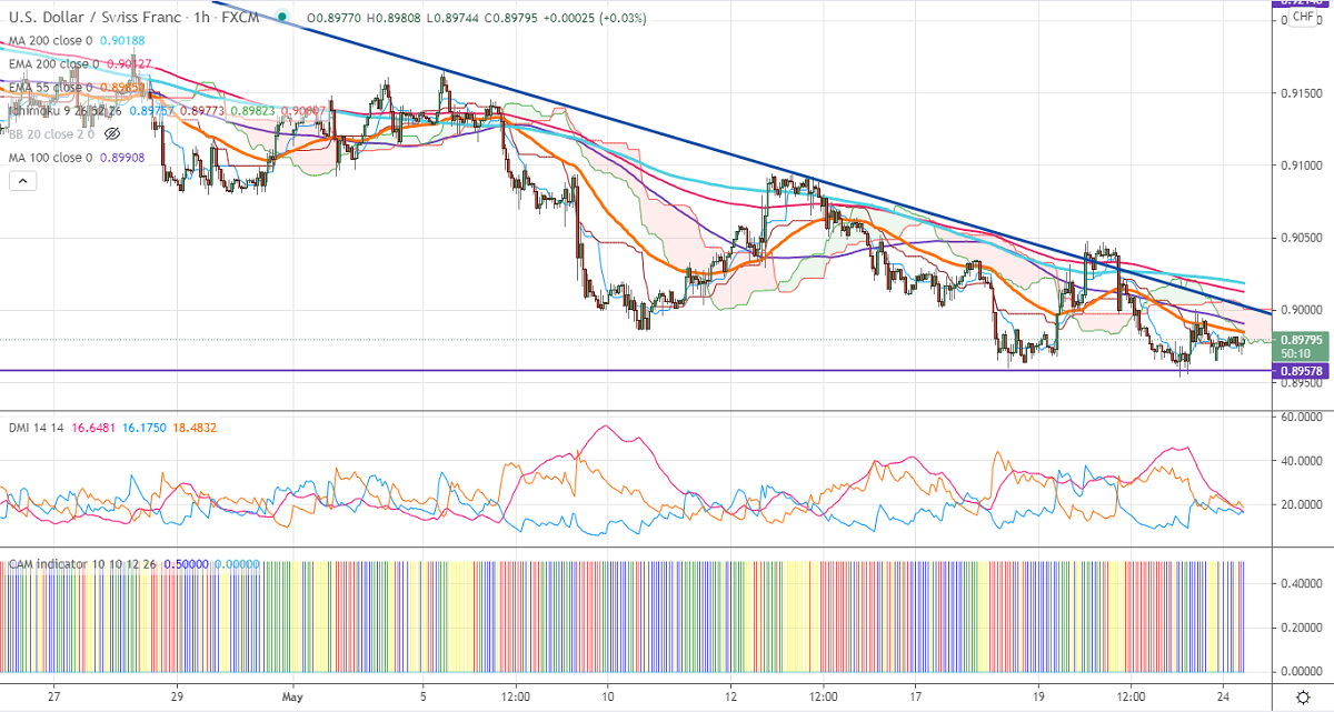 USDCHF is consolidating after hitting a low of 0.89538 on board-based US dollar selling. The pair was one of the worst performers for the past seven weeks and declined more than 5.5%. The decline in US bond yields is also putting pressure on this pair. The US 10-year bond yield lost more than 4.5% after forming a minor top around 1.705%. The manufacturing PMI jumped to 61.5 in Apr vs an estimate of 60. The services PMI hits record high 70 points in May well above forecast 64.3. The US dollar index upside capped by 200- H MA, any breach above 90.21 confirms intraday bullishness. The long-term trend is still on the downside as long as resistance 0.94725 holds.