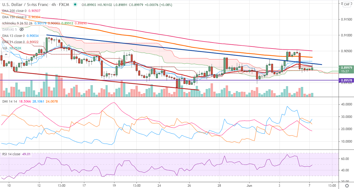 The pair is holding below 4- Hourly Tenken-Sen, Kijun-Sen, and cloud. The near-term support is around 0.8980. Any indicative break below will take the pair to next level to 0.8960/0.8920. On the higher side, near-term resistance is around 0.9054. Any convincing breach above targets 0.9075/0.9095/0.9150.
