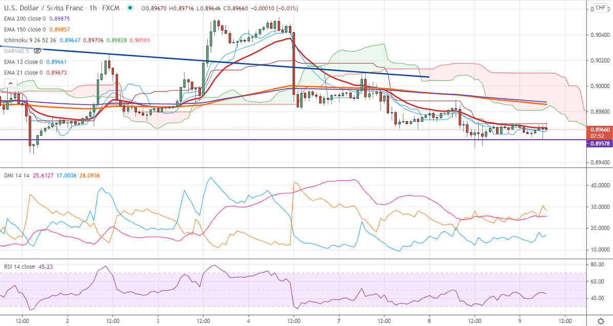 The pair is holding below 4- Hourly Tenken-Sen, Kijun-Sen, and cloud. The near-term support is around 0.8960. Any indicative break below will take the pair to next level to 0.8920. On the higher side, near-term resistance is around 0.9030. Any convincing breach above targets 0.9055/0.9075/0.9095/0.9150.