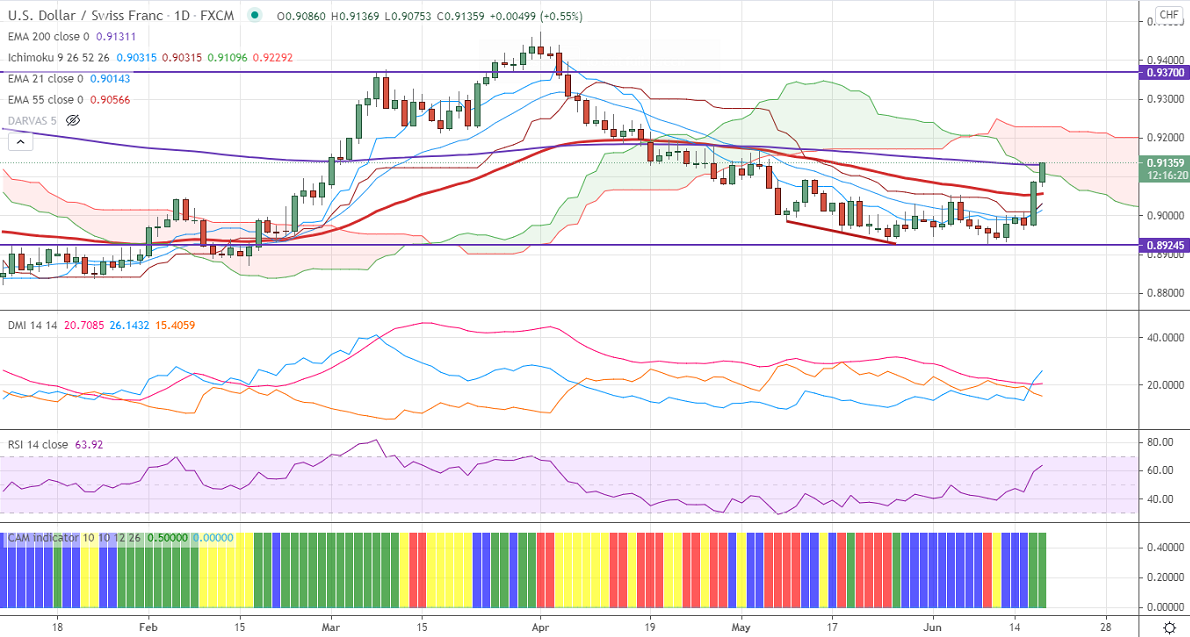 USDCHF has formed a double bottom around 0.8920 and surged nearly 200 pips on hawkish Fed monetary policy. The central bank has kept its rates unchanged and upgraded its growth and inflation outlook. The Fed dot plot shows that there will be two rate hikes in 2023. The US 10-year bond yield surged more than 10% after the monetary policy. The pair is holding well above 0.9100 level and hits an intraday high of 0.91327.