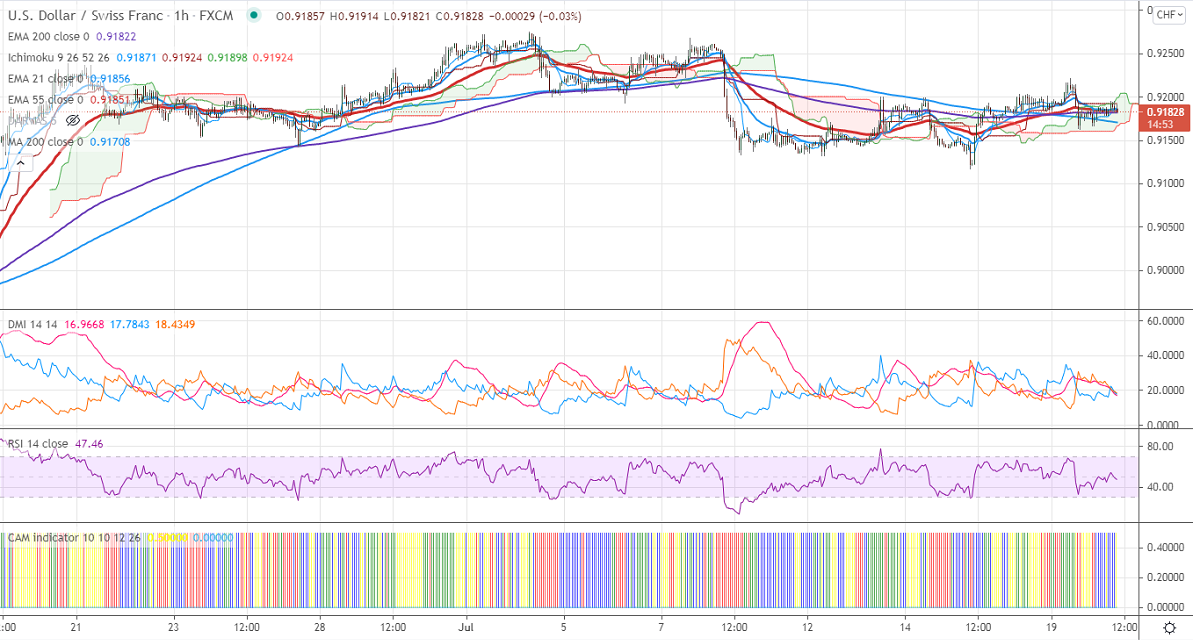 The pair has declined after a minor pullback above 0.9200 level. The intraday trend is neutral as long as resistance 0.92750 is intact. The surge in the number of delta corona variants has increased the demand for safe-haven assets like the Swiss franc and yen. The US 10-year yield hits 1.179%, the lowest level in five months as delta corona spread might dampen the economy. USDCHF hovering around 0.9154.