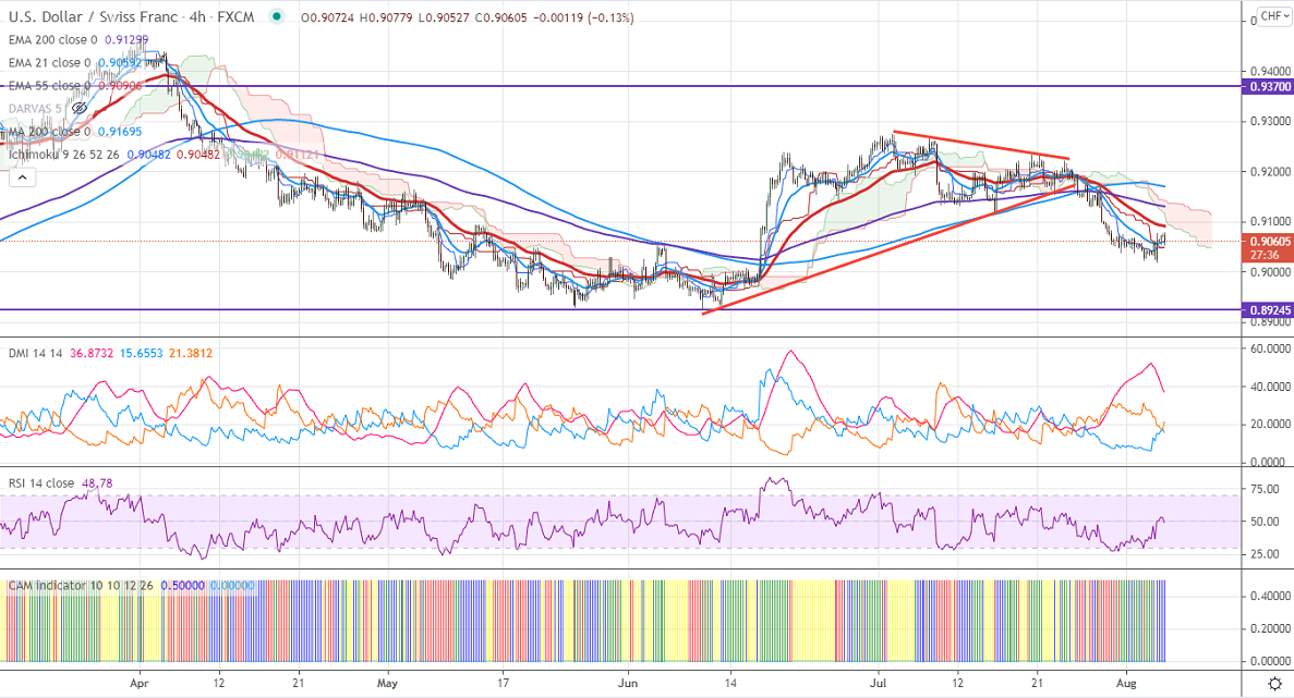 The pair has once again declined after a minor pullback to 0.90775 despite the strong US dollar. The increase in risk aversion due to the surge in coronavirus cases is dragging the pair further down. It hits a record high in July at 64.1 compared to a forecast of 60.40. The US dollar gained and holding well above92 level. While US private sector has added 33000 jobs in July well below expectations of 695000. At the time of writing, USDCHF is hovering around 0.90567, up 0.08%.