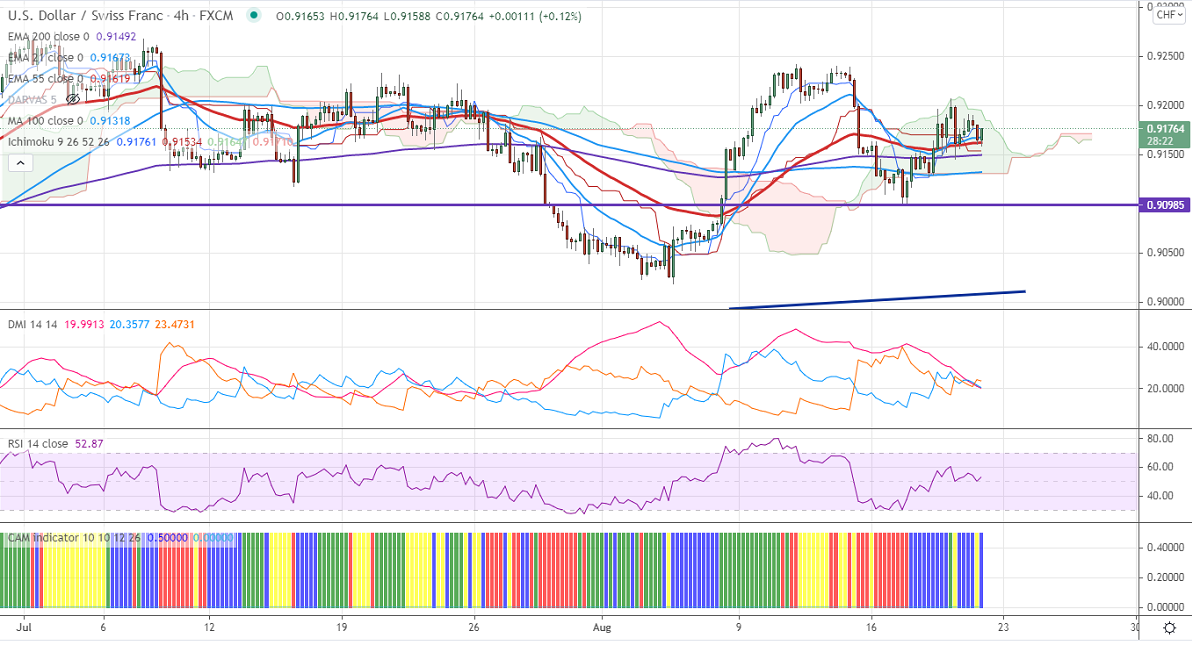 The pair is consolidating after a minor pullback to 0.92069. The increase of risk aversion is supporting the Swiss franc from further sell-off. The Philly Fed manufacturing index fell to 19.4 compared to a forecast of 23.20, the lowest level since December. The number of people who have filed for unemployment benefits declined by 29000 to 348000, a 17-month low. The Yen, Swiss franc, and Dollar are the strongest currencies this week as the spread of delta variant and Afghanistan political crisis. At the time of writing, USDCHF is hovering around 0.91633, down 0.23%.