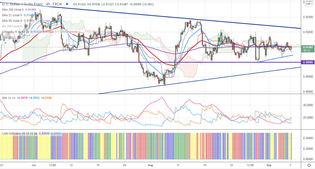 The pair is trading in a narrow range between 0.9100 and 0.91997 for the past two weeks. The US dollar index has started to recover from a low 91.94 made after dismal US jobs data. Any breach above 92.50 confirms intraday bullishness. At the time of writing, USDCHF is hovering around 0.91507 up 0.05%.